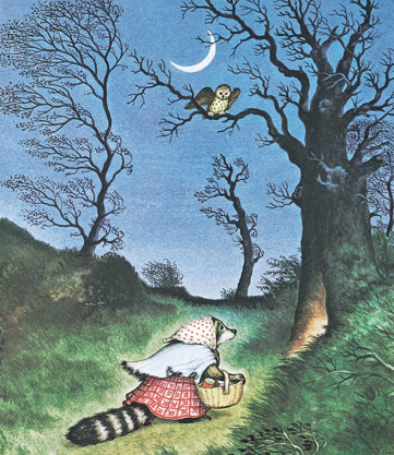 原因很简单,因为外面太危险、太可怕了呀。书中描绘了一个场景,那是浣熊妈妈在夜晚的时候独自出门,深蓝色的天空中只有一弯发着冷光的新月,狂风把树木的枝丫都吹弯了,黑黢黢的大树张牙舞爪的,万籁俱寂,只能听到猫头鹰的叫声......浣熊妈妈裹紧了身上的披风,向家里走去。