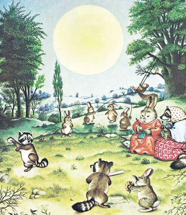 月圆的时候,黑暗被驱散明亮的月光驱散,大家都可以放心地出来玩。小兔子蹦蹦跳跳,公牛和母牛双双起舞,夜莺唧唧啾啾地叫着,小浣熊也可以和其他小浣熊一起玩......