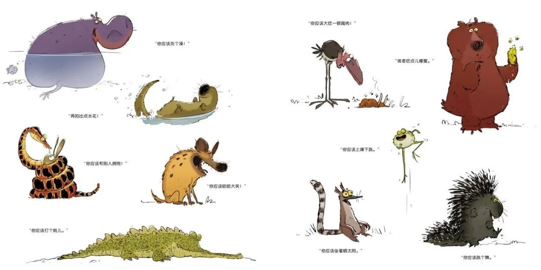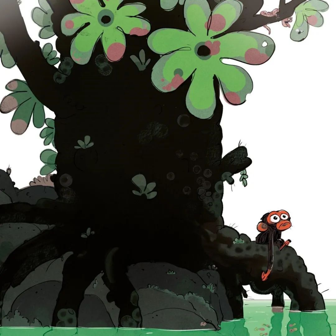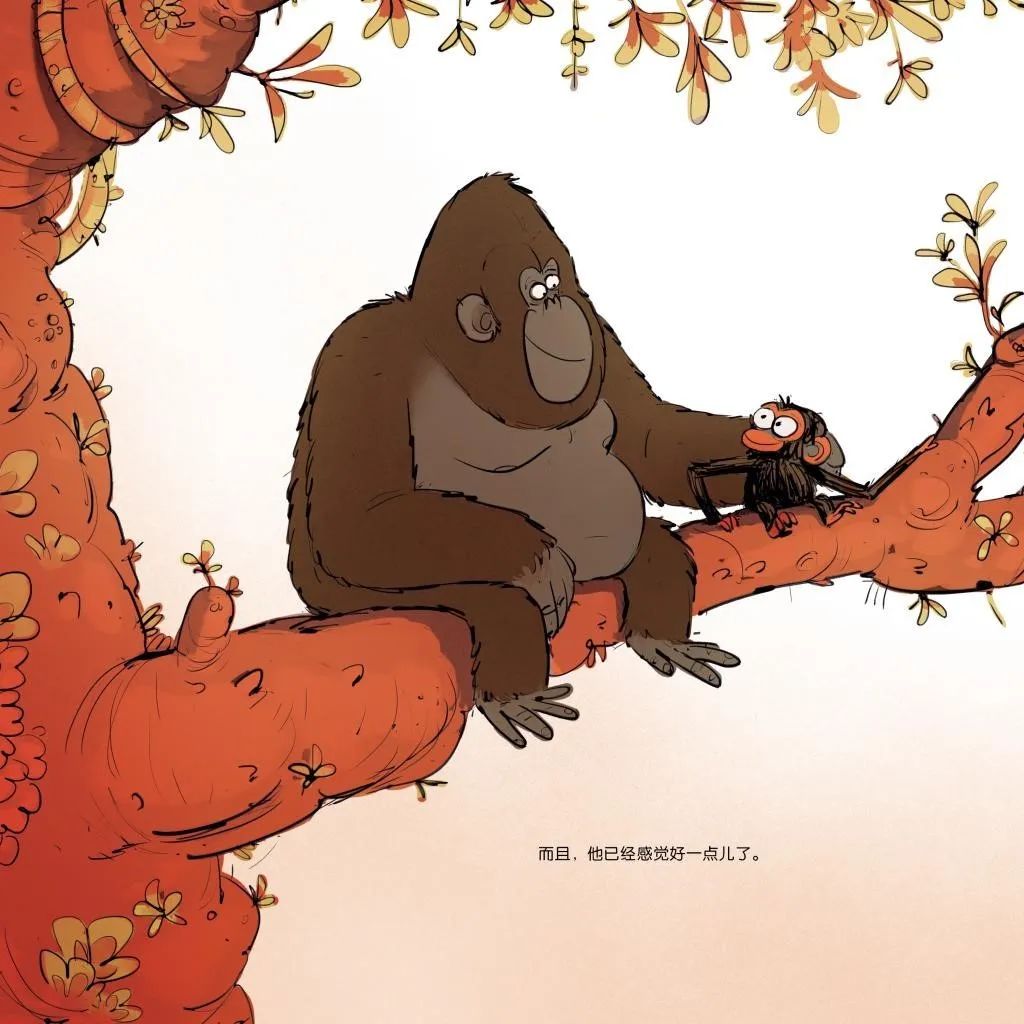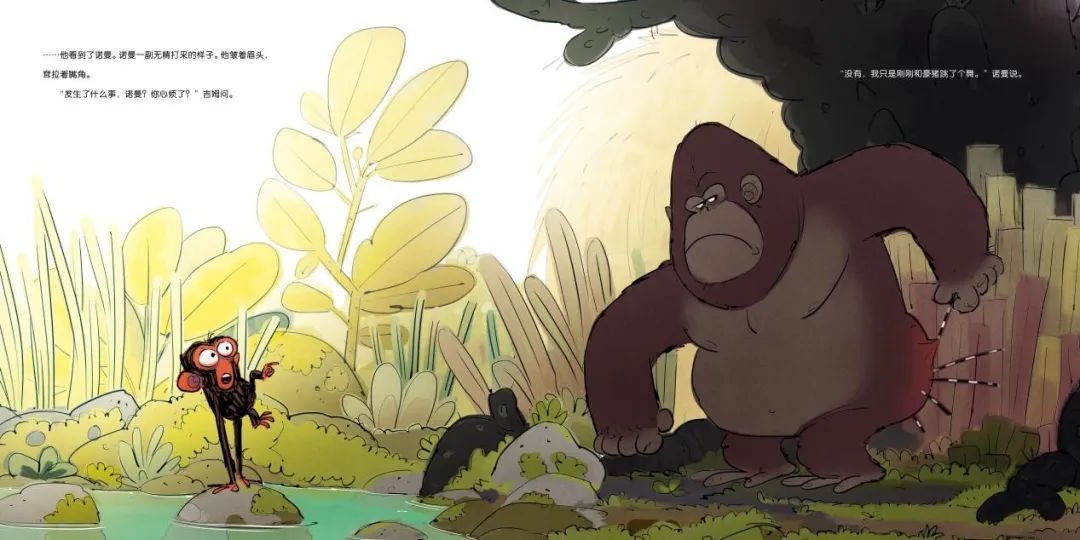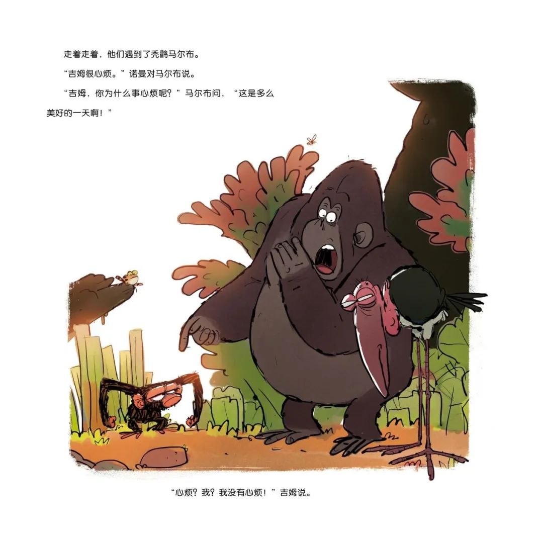 他为《心烦的猴子》绘制的插画也有着明显的卡通风格,动物们生动夸张的面部表情和肢体动作,明亮的配色,还有细节处流露的小幽默,都让这个情绪主题的故事变得轻盈明快起来。