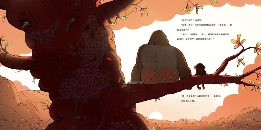 好的作品、适合孩子的书,一定都是不说教的,而是用故事本身、图画本身去打动孩子。《心烦的猴子》是一本讲情绪的书,从头到尾没有一句话甚至一个词在说教,但我们看的过程中会不由自主地代入吉姆的心境,感受他的心烦、窘迫、愤怒、委屈、难过和“感觉好一点儿”,会自然而然地了解到:原来我们不需要时时刻刻都开心,更不用假装开心,承认和接纳每一种情绪就好。