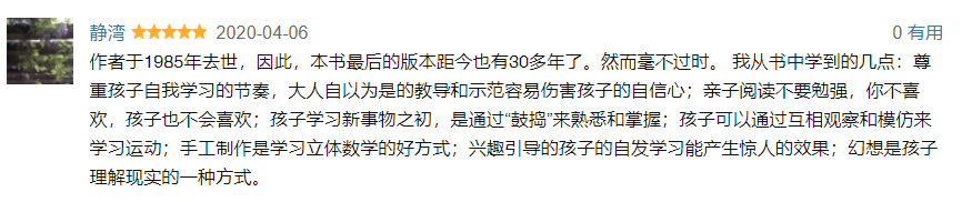 从另一方面,这本书似乎鼓励了一些人——父母和老师——更认真地对待孩子,更近地观察孩子,更仔细地思考孩子们行为的意义,要更喜欢、更信任、更尊重、更欣赏他们。这本书还可能使得一些成年人相信,他们从自己和孩子在一起的经验中已经了解到的关于孩子的事情是真的,例如孩子很聪明、渴望学习、渴望成为我们的世界中有用的一部分。